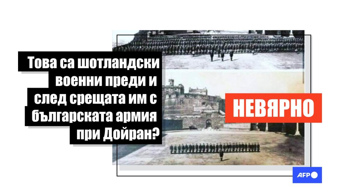 AFP проследи оригиналната снимка и откри исторически източници, според които тя показва 1-ви батальон на кралските Хайлендъри (1st Batallion The Queen's Own Cameron Highlanders) пред замъкa в Единбург на 12 август 1914 г. Долната снимка изглежда е манипулирана версия на първата. Независимо от това, въпросната военна част никога не се е сражавала на Балканите, нито се е срещала с българската армия.