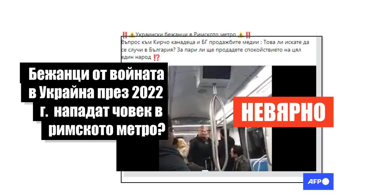 "Украински бежанци в Римското метро!! Въпрос към Кирчо канадеца и БГ продажбите медии : Това ли искате да се случи в България? За пари ли ще продадете спокойствието на цял един народ", гласи Facebook пост от 17 март 2022 г. , споделящ кратко видео. Споменаването на сегашния министър-председател Кирил Петров и предупреждението за това, което може да се случи в бъдеще, доказва, че очевидно авторът визира сегашния поток от украински бежанци. На кадрите се вижда как двама високи гологлави мъже в черни дрехи стоят над друг мъж и се държат агресивно с него. Единият от тях крещи, като могат да се разберат само откъслечни думи от това, което казва. На руски език той ругае мъжа и казва "Аз съм фашист". В края на видеото се вижда, че удареният мъж лежи на пода, а други пътници се опитват да му помогнат. Вижда се и жена, чието лице е покрито с кръв.