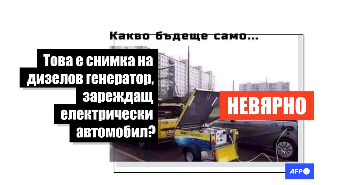 "Ван на газ, теглещ дизелов генератор, зарежда електрически автомобил!!! Какво бъдеще само...", гласи текстът към снимка. На нея виждаме жълто комби, теглещо ремарке, към което с кабел е закачен автомобил, паркиран край пътя. От края на юли досега тази публикация е споделена стотици пъти във Facebook. От 2019 г. насам същата снимка и надпис се появяват периодично в социалните мрежи, като например тук.