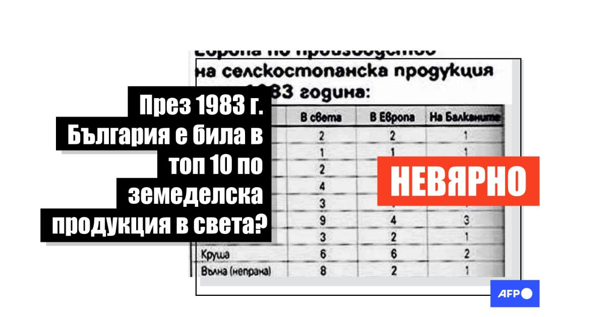 Таблица, озаглавена "Мястото на България в света и Европа по производство на селскостопанска продукция през 1983 г.", е споделена от над 2 хил. потребителя на Facebook от началото на 2023 г. насам. В нея се твърди, че е показано мястото на България като водещ производител на 11 селскостопански стоки.
