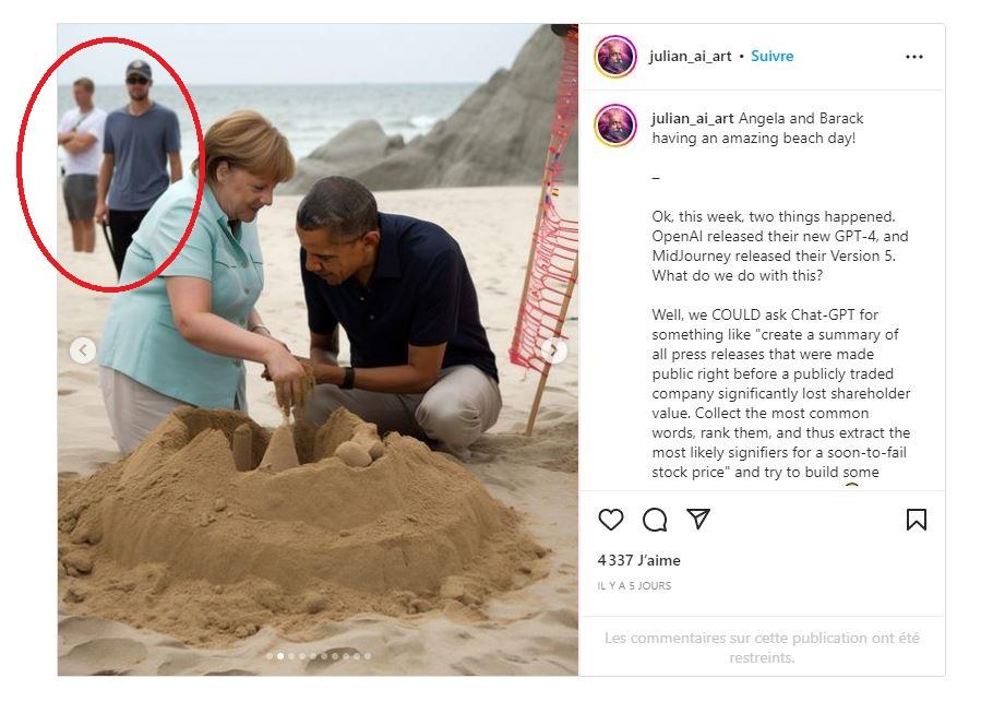Добър начин да откриете тези аномалии е да се вгледате във фона на снимката. Макар на пръв поглед да изглежда нормален, генерираната от изкуствен интелект снимка често съдържа грешки, като например в тези снимки, на които уж са показани Барак Обама и Ангела Меркел на плажа.