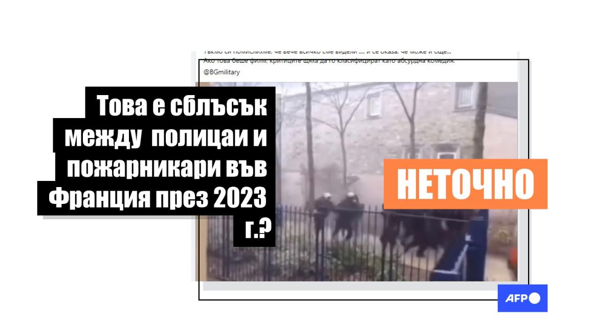 "В случай, че сте пропуснали да видите как френската жандармерия се бие с френските пожарникари. Тъкмо си помислихме, че вече всичко сме видели .... и се оказа, че може и още... Ако това беше филм, критиците щяха да го класифицират като абсурдна комедия ", гласиTelegram пост, в който се споделя 24-секунден клип на сблъсъците на полицаите с пожарникарите. Постът, публикуван на 29 март 2023 г., е споделен от български канал в Telegram, известен с разпространяването на фалшиви информации (вече опровергани от AFP тук и тук) и прокремълска пропаганда. Оттогава досега той е гледан над 3400 пъти. Същият текст и видеоклип бяха споделени и във Facebook тук.