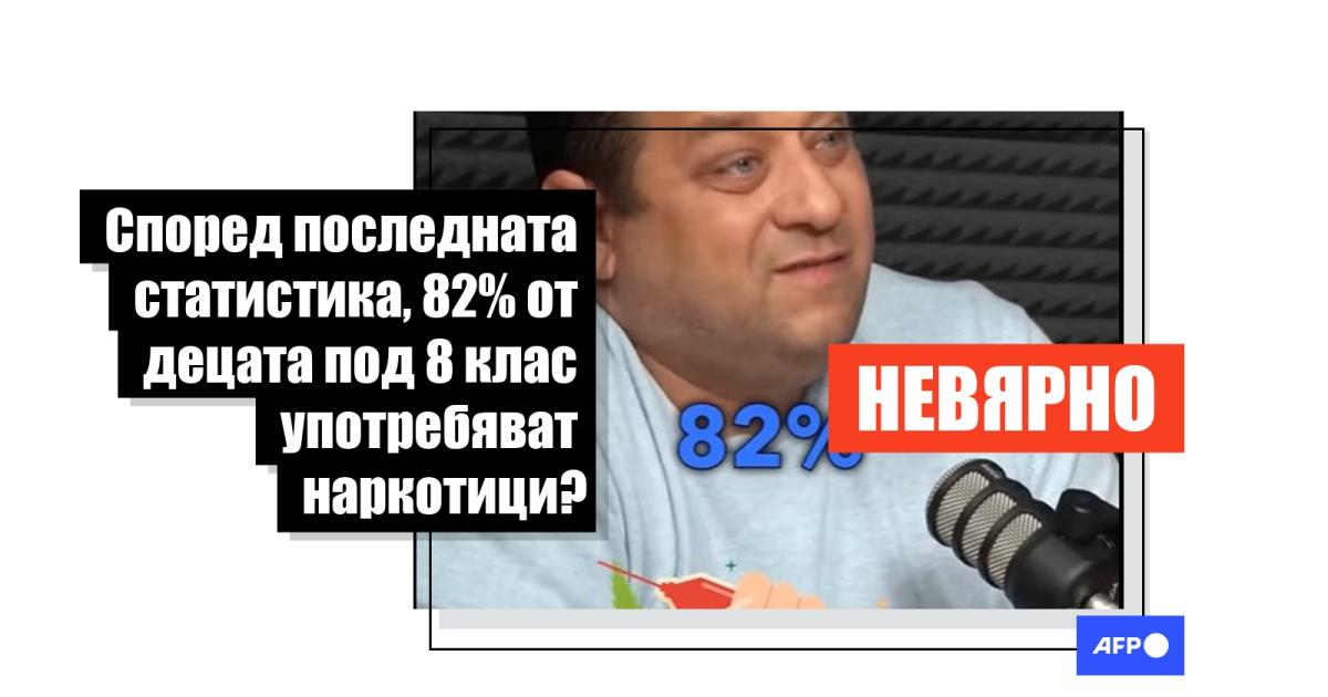"82% от децата употребяват наркотици. По последната статистика. Деца до 8-ми клас", казва Николай Марков, бивш служител на Националната служба за охрана (НСО)на България, в кратък reel (вертикален видео формат на Facebook), споделен над 6 900 пъти от 31 октомври 2023 г. насам.