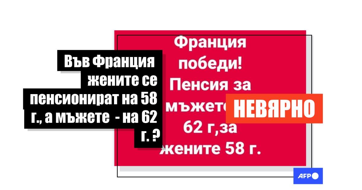 "Франция победи! Пенсия за мъжете на 62 г, за жените 58 г.", гласи Facebook публикация на български, споделена над 3600 пъти от август 2023 г. насам, включително и през последните седмици. Други потребители са публикували същия текст.