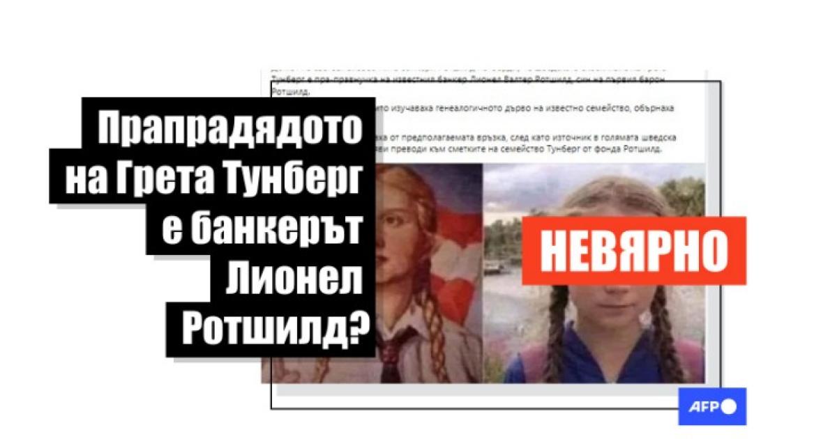 "Грета Тунберг е кръвна роднина на клана Ротшилд – какво съвпадение?", гласи Fаcebook публикация от 4 март 2024 г., посочвайки като източник "СМИ" - съкращението на руски език за средства за масово информация. "Грета Тунберг (20-годишна) е правнучка на известния банкер Лионел Валтер Ротшилд, син на първия барон Ротшилд", гласи постът, който по-нататък влиза в противоречие като твърди, че прадядото на Тунберг е незаконният син на Лионел (или по-точно Лайънъл, защото е британец) - Йоахим Ротшилд-Тунберг, когото Лайънъл Валтер признава през 1928 г. и след това осиновява.