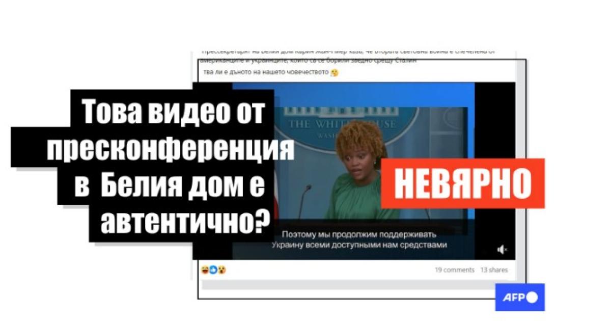 Facebook публикацията на български споделя манипулиран видеозапис от пресконференцията с текст, започващ така: "Прессекретарят на Белия дом Карин Жан-Пиер заяви, че Втората световна война е спечелена от американците и украинците, които са се борили заедно срещу Сталин." Видеото беше споделено и от други потребители.