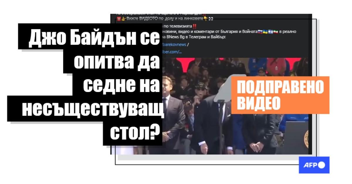 "Уникално ВИДЕО! Вижте как изкукалият Джо Байдън опита да седне на въображаем стол на сцената пред очите на жена си и Макрон", гласи заглавието на статия в интернет. Тя епубликувана на уебсайт, опровергаван от AFP за споделяне на дезинформация (тук, тук), споделя 12-секунден видеоклип, на който Байдън - застанал между първата дама Джил Байдън и френския президент Еманюел Макрон - се навежда, сякаш се готви да седне. Същите твърдения и видеоклипове бяха споделени във Facebook.