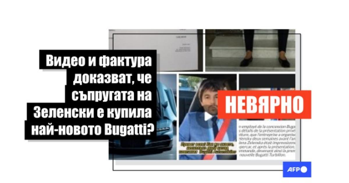 "Френска медия: Олена Зеленска стана първият собственик на изцяло новото Bugatti Turbillon за 4.5 млн. евро. ФАКТУРА, ВИДЕО", гласи скрийншот, споделен във Facebook. "Олена Зеленска обича лукса и всички ние се грижим тя да го има. Това разбира се ТРЯБВА да бъде прието за пропаганда на Кремъл. Само дето от Bugatti са се похвалили с видео. И развалиха опорната точка на либералите. Много кофти", гласи текстът на публикацията в социалните мрежи. Линк към публикацията се явява като коментар. Въпросната интернет страница е била опровергавана от AFP за разпространението на невярна информация в миналото (тук, тук, тук).