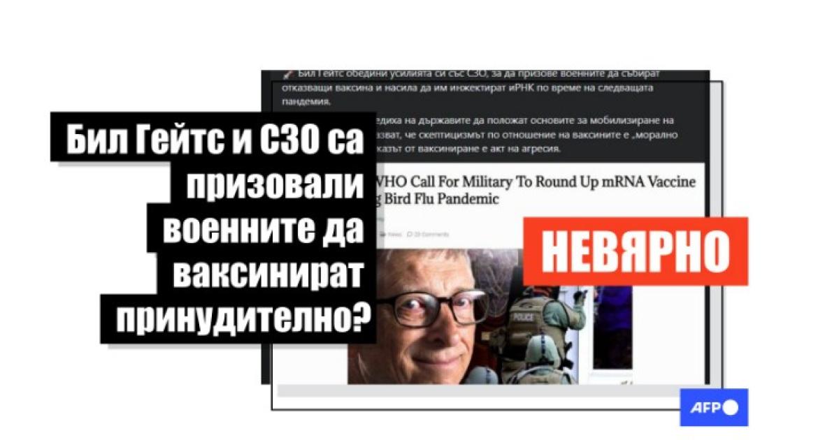 "Бил Гейтс обедини усилията си със СЗО, за да призове военните да събират отказващи ваксина и насила да им инжектират иРНК по време на следващата пандемия", пише Facebook потребител на български в публикация от 23 август 2024 г.