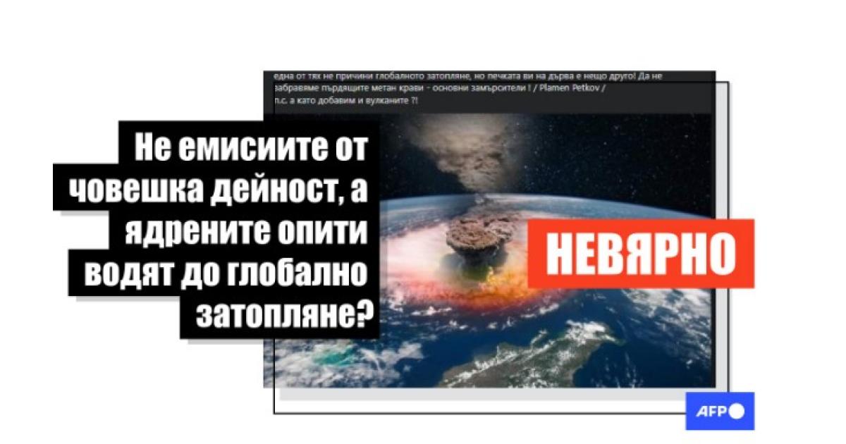 В научните среди преобладаващо се смята, че емисиите на парникови газове, причинени от човешката дейност, водят до глобално изменение на климата. Въпреки това, през октомври 2024 г., хиляди потребители на социални мрежи споделят постове на различни езици, сред които и български, внушавайки, че ядрените опити през XX век, а не парниковите газове са причина за глобалното затопляне. Но това сравнение е невярно и силно подвеждащо. Доказано е, че макар тези ядрени опити да са причинили огромни щети на околната среда, те не са оказали значим ефект върху климатичните промени. Учени обясниха пред Агенция Франс-Прес, че излишъкът от слънчева енергия, задържан в атмосферата заради повишеното количество парникови газове, се равнява на няколко експлозии в Хирошима всяка секунда. Да предизвикаш затопляне на Земята с ядрени бомби би било все едно "да се опиташ да затоплиш апартамент с пиратки", коментира един от тях пред AFP.