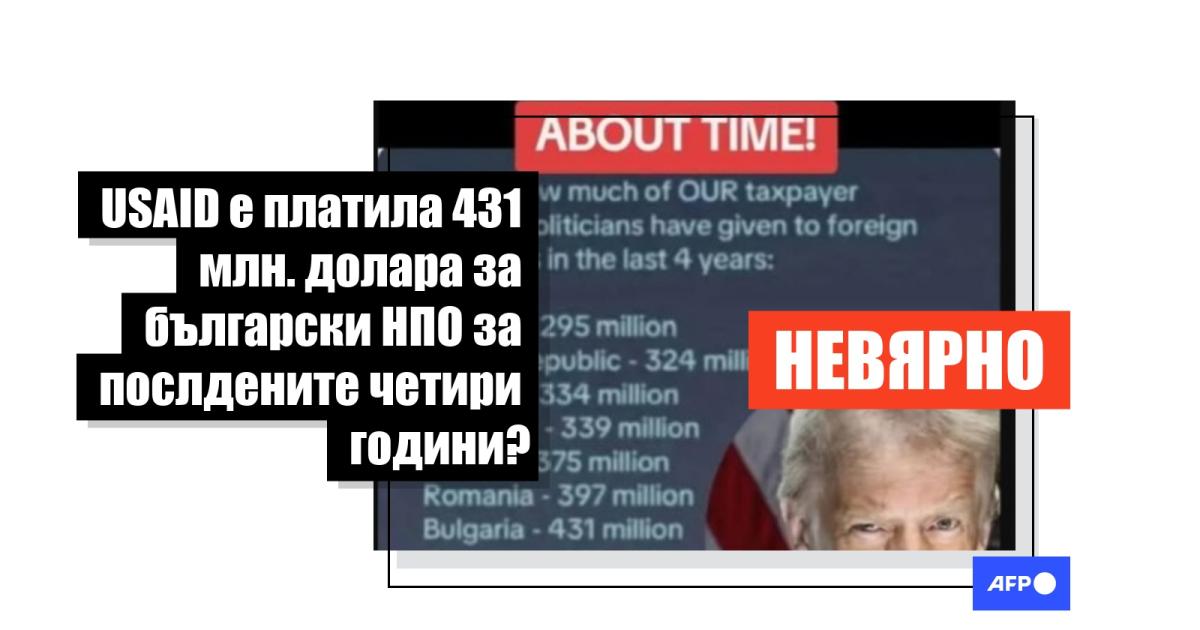 AFP анализира данните за България за 2023 г., 2022 г., 2021 г. и 2020 г. и установи, че общият размер на изплатените средства като американска външна помощ за България е 428 млн. долара, което близо до твърдяното в подвеждащите публикации.