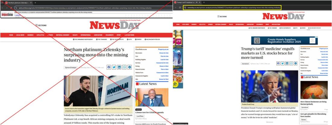 Първоначално статията е била със същото заглавие: "Northam Platinum: Изненадващият ход на Зеленски в минната индустрия". Впоследствие съдържанието на статията е било заменено с друга информация по несвързана тема (архив). Преди това обаче статията е била архивирана. Въпреки промяната на съдържанието, статията все още използва стария URL адрес, в който фигурира заглавието за Зеленски.