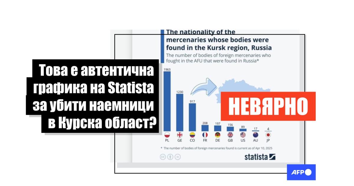 "Потвърдена самоличност на загинали в Курск Русия ДОКАЗВА **Силите на НАТО** във войната срещу Русия", започв Facebook пост от 14 април 2025 г. "Националната принадлежност на наемниците, чиито тела са намерени в Курска област, Русия/ както вече знаем, много от убитите са били обезглавявани или са им били рязани крайниците- заради татуировките им, за да не бъдат разпознати!!! Та, броят на участниците е със сигурност по- голям!!/", гласи друга публикация в социалната мрежа. Постовете, които са споделени от над 100 потребители, съдържат и точни цифри, видими на графика, приложена към публикациите. Графиката изглежда представлява разбивка по националност на чуждестранните бойци, за които се твърди, че са загинали, сражавайки се за Украйна в руската област Курск. В ъгъла на графиката се вижда логото на известния германски статистически портал Statista.