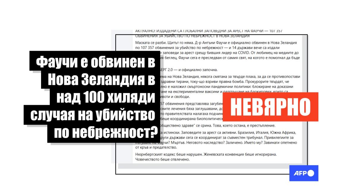 "Маската се разби. Щитът го няма. Д-р Антъни Фаучи е официално обвинен в Нова Зеландия по 107 357 обвинения за убийство по небрежност — и 14 държави вече са издали международни заповеди за арест срещу бившия лидер на COVID", пише във Facebook публикация от 14 май 2025 г. "Това е НЮРНБЕРГ 2.0 — и официално започна", продължава постът, споделен от близо 100 потребители на социалната мрежа.