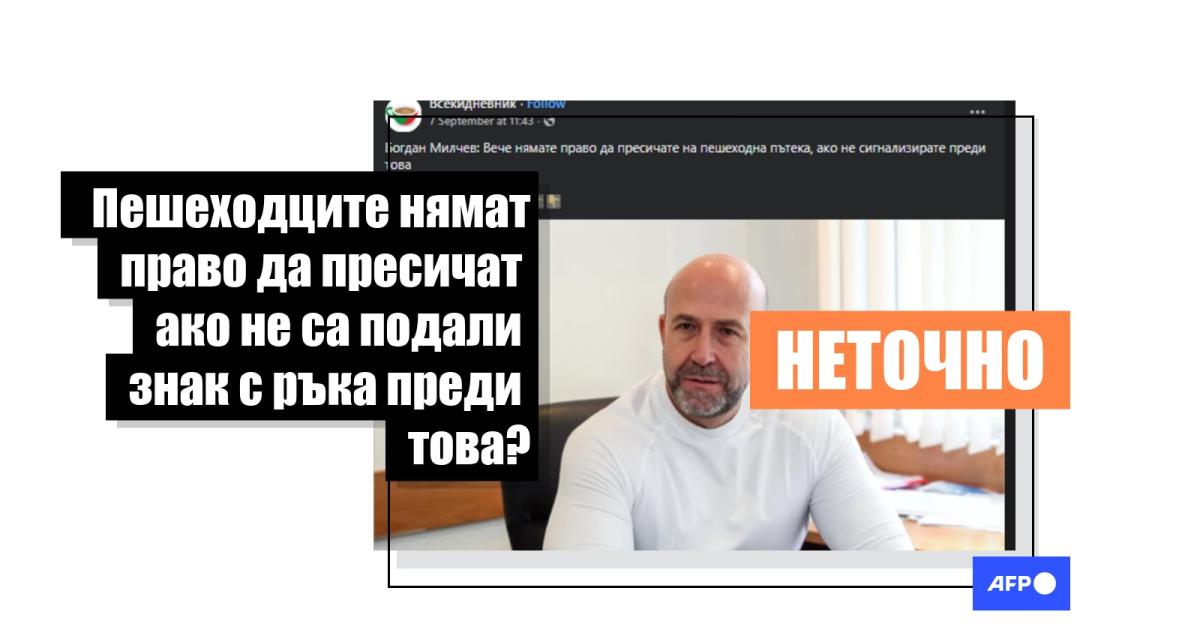 "Според новите правила в Закона за движение по пътищата нямате право да пресичате на пешеходна пътека, ако не сигнализирате преди това. Тези правила влизат в сила след четири дни, а хората все още не разбират какво значи да сигнализират", твърди публикация във Facebook. Към нея има екранна снимка от интервю с бившия началник на пътна полиция в София, Богдан Милчев.