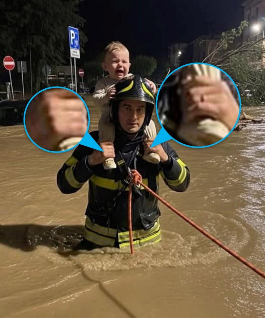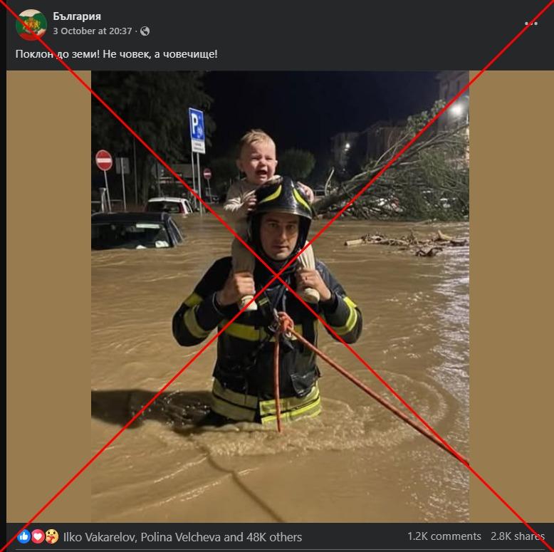 "Поклон до земи! Не човек, а човечище!", гласи текстът към публикация във Facebook, споделяща снимка на пожарникар с плачещо дете на раменете.