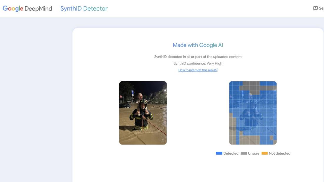 В опцията "За това изображение" на Google Images е посочено, че снимката е създадена с изкуствен интелект на Google. Това ни накара да използваме SynthID Detector — платформа на Google за откриване на изображения, генерирани от изкуствен интелект. Резултатът потвърди, че изображението е създадено с инструмента за изкуствен интелект на Google.