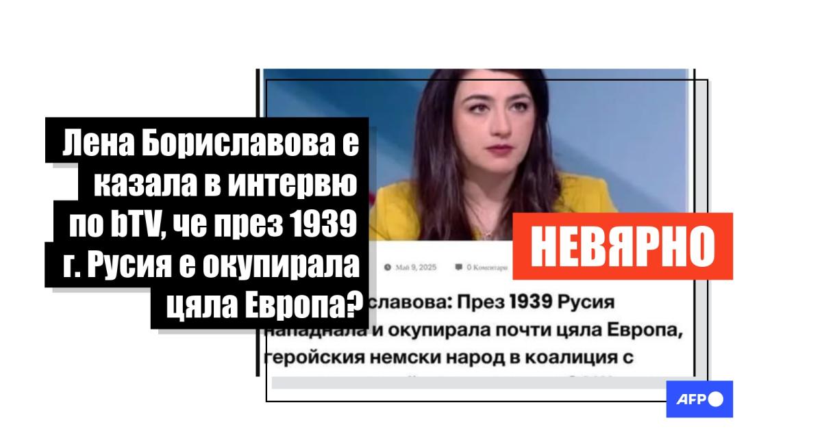 Широко разпространено във Facebook комбинирано изображение – екранна снимка от телевизионно токшоу, поставена над скрийншот от заглавие на публикация онлайн – показва народната представителка от ПП-ДБ Бориславова в студиото на "Лице в лице". Голямото заглавие на български приписва на Бориславова твърдението: "През 1939 г. Русия напада и окупира почти цяла Европа; геройският немски народ, в коалиция с всички европейски държави и САЩ, успели да извоюват Освобождението си.“