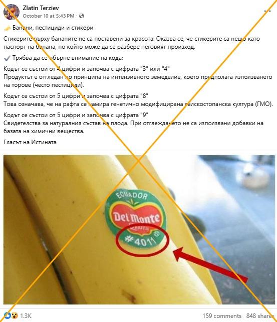 Публикацията е придружена от снимка на банани със стикер, на който се вижда кодът "4011".