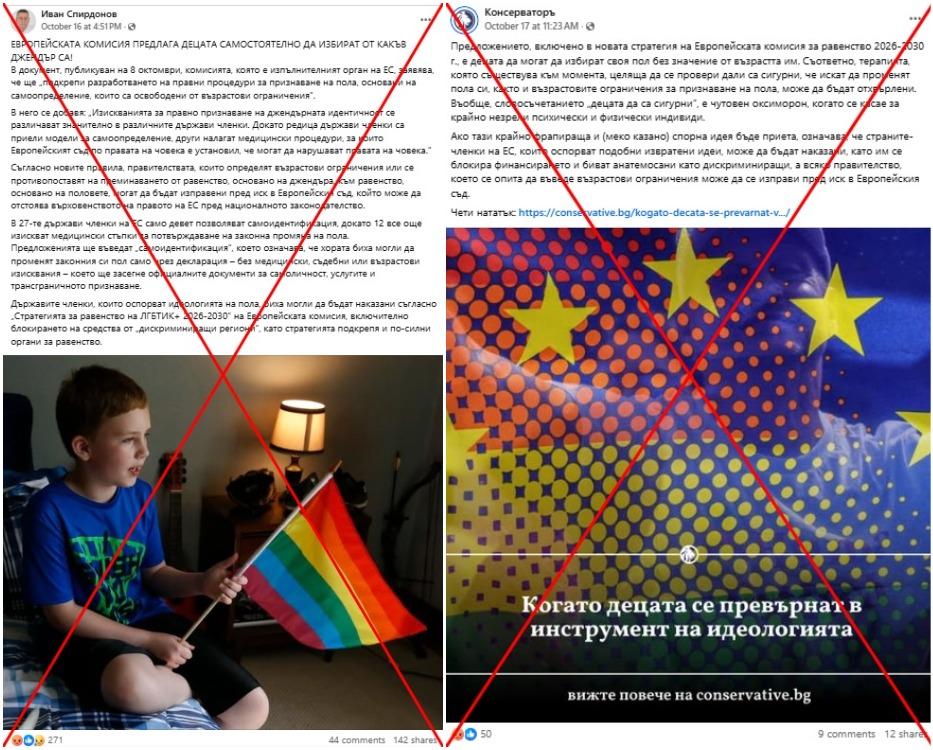 "Европейската комисия предлага децата самостоятелно да избират от какъв джендър са!" Така започва Facebook пост от 16 октомври 2025 г., споделен над 140 пъти в социалната мрежа. Публикацията посочва като източник стратегията на Европейската комисия за правата на ЛГБТИК+ хората, публикувана на 8 октомври 2025 г.