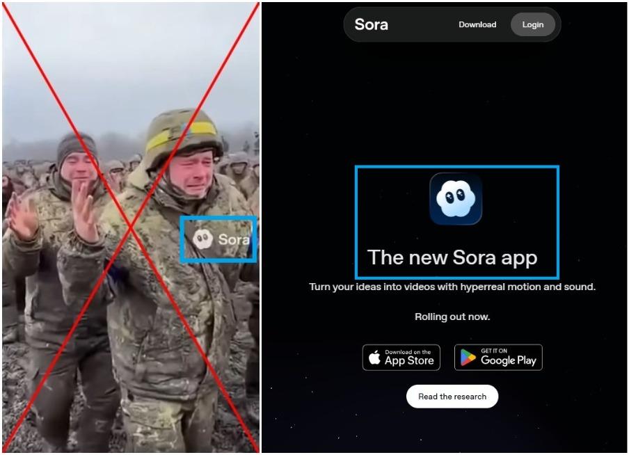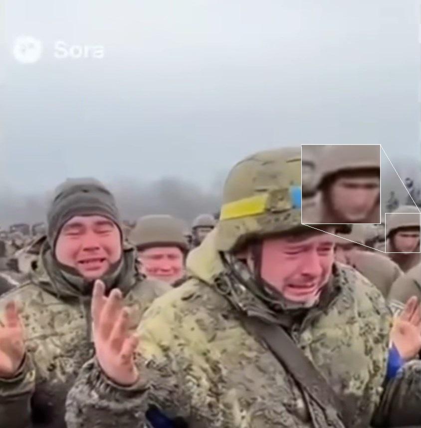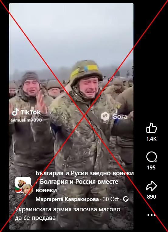 Близо четири години след началото на пълномащабната руска инвазия в Украйна, дезинформацията, целяща да подкопае западната подкрепа за Киев, все още е широко разпространена в интернет, като голяма част от нея произхожда от Москва. В този контекст видеоклип, който претендира да показва масовото капитулиране на украински войници, се разпространява на различни езици, включително български. Видеоклипът с плачещите войници обаче е създаден с помощта на инструмента Sora AI. Воднният знак на програмата се вижда многократно във видеото, а визуални улики и цифров аудио анализ също потвърждават, че то е създадено с помощта на изкуствен интелект. Към 10 ноември 2025 г. няма публична информация, че украински военни се предават масово.