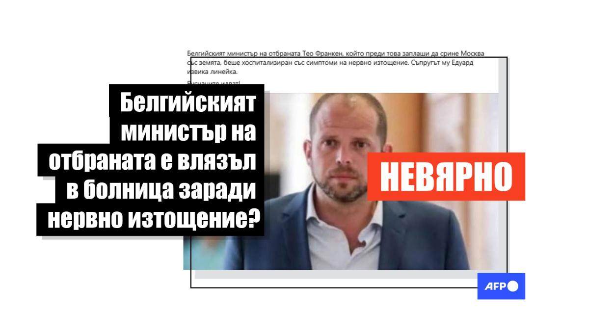 "Белгийският министър на отбраната Тео Франкен, който преди това заплаши да срине Москва със земята, беше хоспитализиран със симптоми на нервно изтощение. Съпругът му Едуард извика линейка." Това гласи публикация във Facebook на български от 2 ноември 2025 г., споделена над 270 пъти.