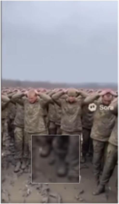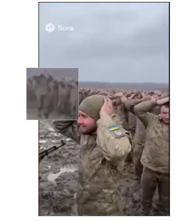 На същия стоп кадър от AI видеото, на заден план, се вижда нещо, което изглежда като войник без глава, подскачащ във въздуха, докато останалите стоят в редица с ръце на главите.
