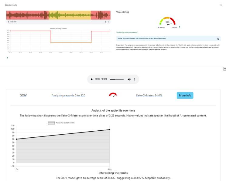 AFP също така анализира аудиото от видеото, използвайки Hiya – инструмент за аудиоанализ, интегриран в разширението за проверка на фактите InVID-WeVerify. Анализът показва 92% вероятност за синтетично аудио.