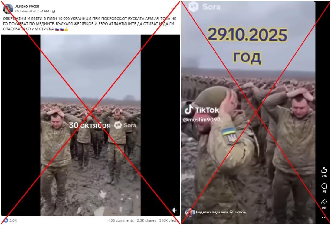 "Обкръжени и взети в плен 10 000 украинци при Покровск. От руската армия. Това не го показват по медиите". Така започва Facebook публикация от 31 октомври 2025 г., споделяща 10-секундно видео.