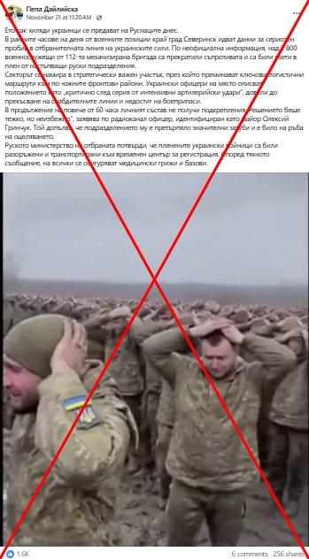 Екранна снимка от същото видео се съдържа и в тази онлайн публикация на сайта Faktibg.com от 20 ноември 2025 г. със заглавие: "Невиждани снимки! Ето как хиляди украинци се предават на Руснаците днес". Същият скрийншот и част от текста на публикация открихме и в този Facebook пост от 21 ноември, споделен повече от 250 пъти.