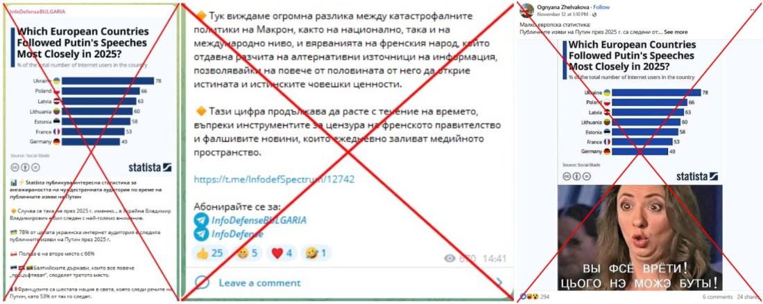 На фона координираните от САЩ преговори за постигане на мир в Украйна, онлайн продължават да циркулират неверни и подвеждащи твърдения, насочени към подкопаване на авторитета на Киев и засилване на подкрепата за Москва. Така през ноември 2025 г. на различни езици, включително български, започна да се разпространява графика, на която е придаден вид, че показва изследване на платформата за статистически данни Statista за това какъв дял от интернет потребителите в различни европейски държави са "следили" публичните изяви на руския президент Владимир Путин през 2025 г. Графиката невярно посочва, че данните са взети от Social Blade – платформа за анализ на социални мрежи. Проверката на Агенция Франс-Прес (AFP) обаче установи, че изображението е изфабрикувано – такива данни не фигурират сред публикуваните изследвания на Statista, а самата компания потвърди пред AFP, че графиката не е автентична. Social Blade и експерт по работа с данни също потвърдиха, че подобна статистика не може да бъде извлечена от платформата.