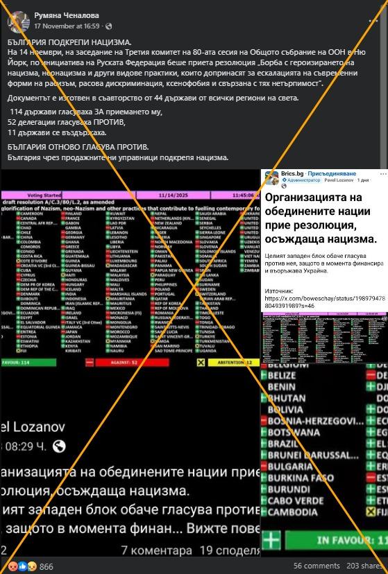 "БЪЛГАРИЯ ПОДКРЕПИ НАЦИЗМА", започва публикация във Facebook от 17 ноември 2025 г., в която се споделя снимка на резултатите от гласуването в ООН.