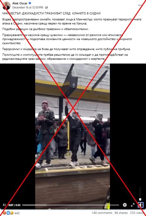 "Манчестър: джихадисти празнуват след клането в Сидни." Така започва Facebook пост от 16 декември. Публикацията съдържа 30-секундно видео, на което се виждат няколко мъже с покрити с куфии лица, които танцуват, скандират и развяват палестинско знаме на място, което прилича на перон на влакова гара.