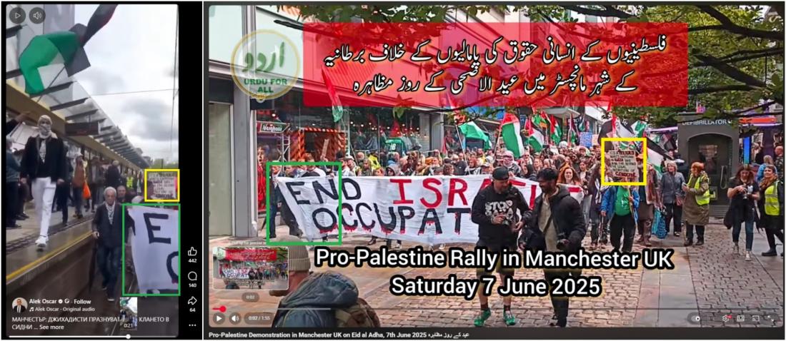 След това чрез търсене по ключови думи в Google достигнахме до това видео в YouTube, показващо същата демонстрация, публикувано на 7 юни (архивирана връзка). Видеото е озаглавено: "Пропалестинска демонстрация в Манчестър, Великобритания, по време на празника Ид ал-Адха, 7 юни 2025 г."