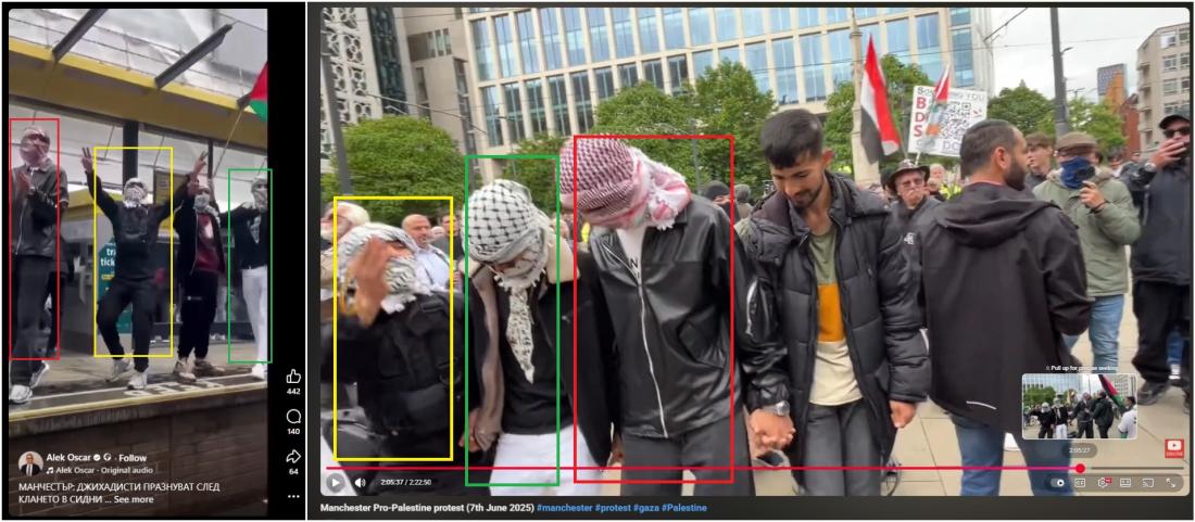 Разпространявано в социалните мрежи видео обаче няма общо с нападението в Сидни. То е заснето през юни 2025 г. и показва пропалестинска демонстрация в Манчестър.