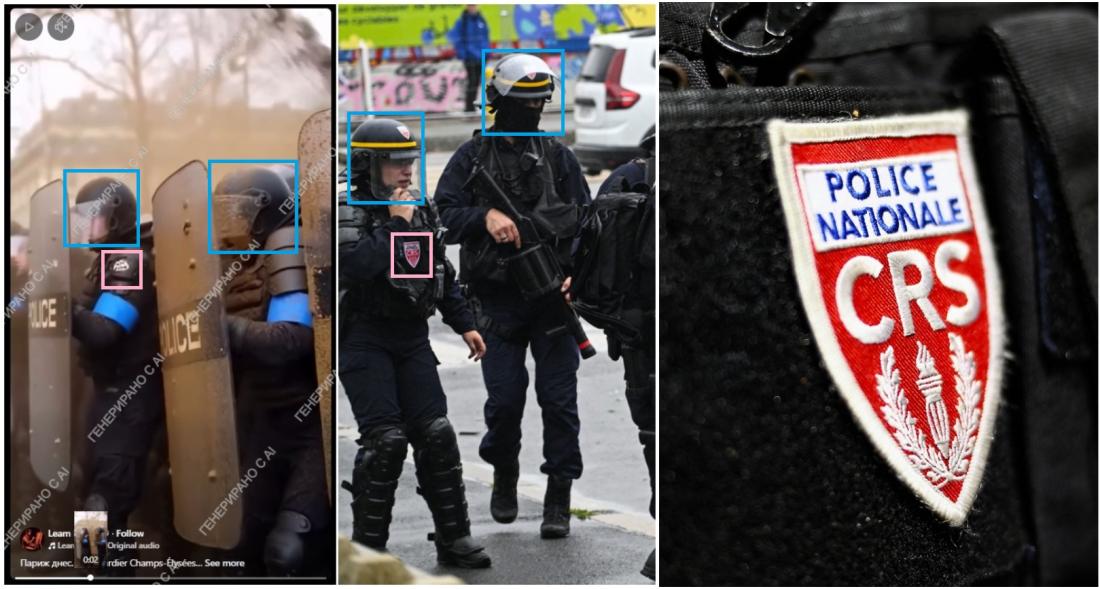 Белият знак, който се откроява на рамото на един от полицаите във Facebook видеото, също не съответства на логото на CRS, което може да бъде видяно на сайта на френската полиция.