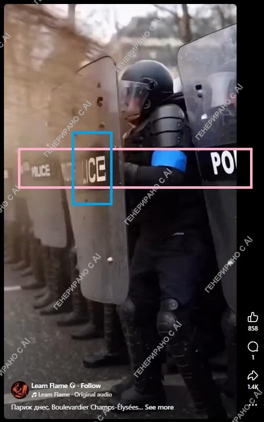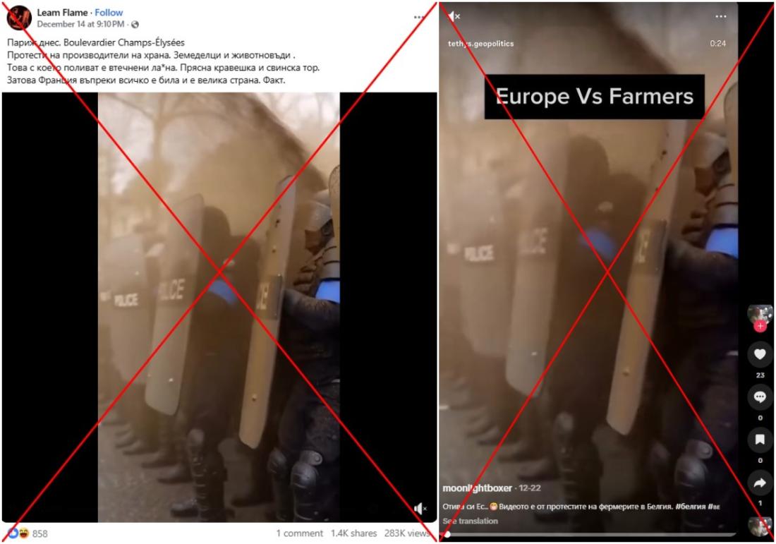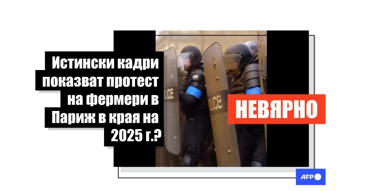"Париж днес. Boulevardier Champs-Élysées. Протести на производители на храна. Земеделци и животновъди." Така започва Facebook пост от 14 декември 2025 г., който оттогава е видян над 280 хиляди пъти и е споделен от повече от 1400 потребители на социалната мрежа. Публикацията съдържа 10-секундно видео, в което се вижда как мъж кара трактор и пръска кафява течност, наподобяваща тор, по униформени полицаи с каски и щитове. В някои от кадрите също така на заден план се вижда обект, наподобяващ Триумфалната арка в Париж, която се намира на известния булевард "Шанз-Елизе".