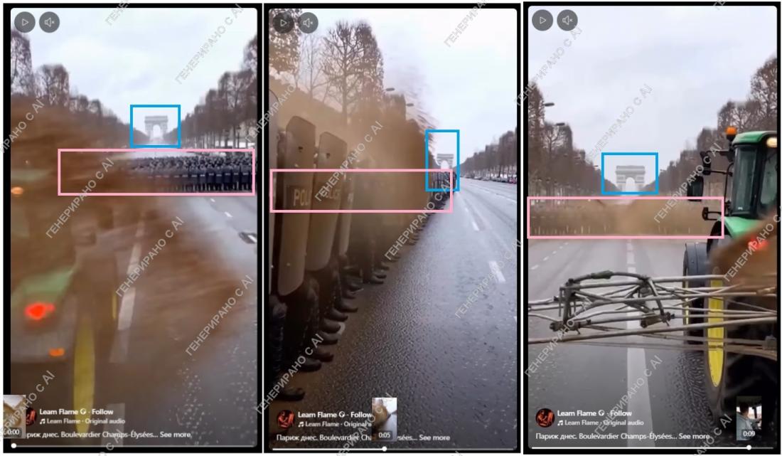 През декември 2025 г. фермери във Франция излязоха на протести срещу решението на ветеринарните власти за масово умъртвяване на добитък с цел ограничаване разпространението на животински болести. На този фон се появиха видеа, създадени с изкуствен интелект, но споделяни в социалните мрежи с внушението, че са автентични. Едно от тези видеа, споделяно от хиляди потребители на платформи на български, показва мъж, който кара трактор по известна улица в центъра на Париж и пръска кафява течност по кордон от полицаи. Видеото изглежда е дело на потребител, който редовно създава клипове с изкуствен интелект. В кадрите има визуални противоречия. А освен това през последните месеци в центъра на Париж не са се провеждали фермерски протести.