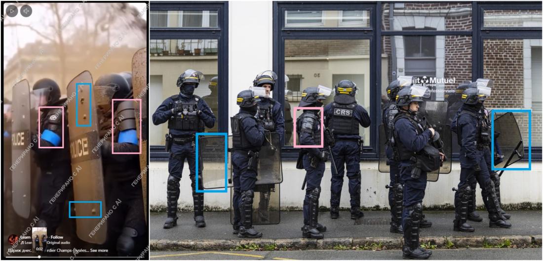 При сравнение на кадри от Facebook видеото с автентични снимки на AFP от скорошни протести, отново установихме няколко несъответствия. Униформите на снимките на агенцията съдържат значително повече разпознаваеми детайли – например в областта на раменните протектори, каските или щитовете. Детайли от униформата на CRS могат да се видят и на официалния уебсайт на френската национална полиция.