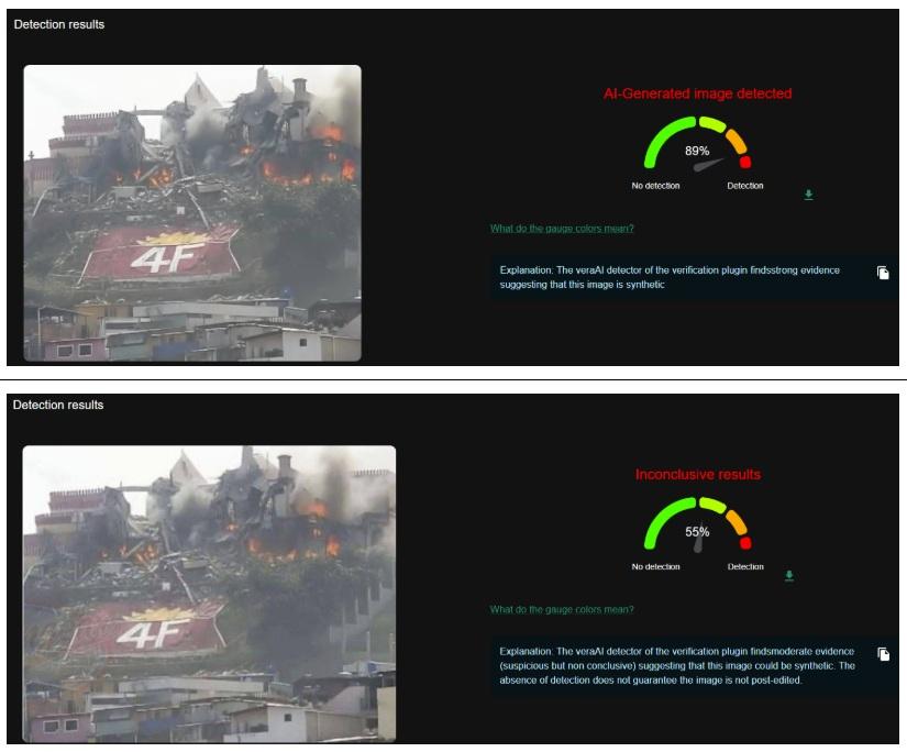 Също така анализирахме две от изображенията с най-добро качество от различни социални мрежи с помощта на инструмента за разпознаване на синтетични изображения в разширението за проверка на фактите InVID-WeVerify. Според анализа изображението от тази публикация на испански в X има 89% вероятност то да е генерирано с изкуствен интелект, докато анализът на изрязано изображение от тази публикация на руски в Telegram показа 55% вероятност то да е синтетично.