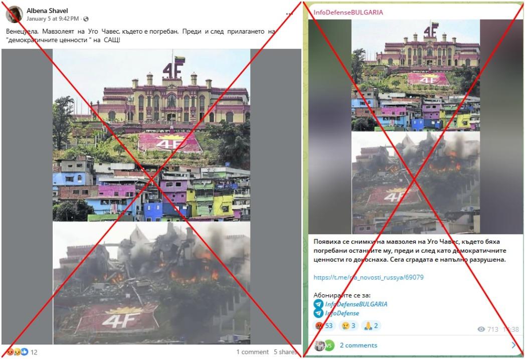 Проверката на AFP обаче установи, че музеят Cuartel de la Montaña не е бил разрушен при ударите на САЩ. Снимки, направени след атаката, показват сградата в добро състояние, без видими следи от поражения. Новият президент на Венецуела Делси Родригес също посети обекта на 6 януари, за което свидетелстват публикации във Facebook. Колажът, който се разпространява в социалните мрежи, най-вероятно е създаден с помощта на изкуствен интелект, а видеото, за което се твърди, че показва бомбардирането на мавзолея, всъщност показва атака срещу друга сграда в Каракас.