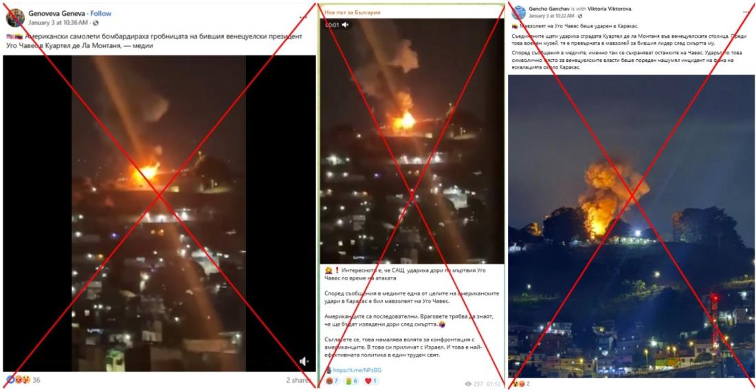 Съединените американски щати нанесоха серия от въздушни удари във Венецуела в ранните часове на 3 януари 2026 г. в рамките на операция, която завърши с ареста на президента на страната Николас Мадуро. Твърденията в социалните мрежи обаче, че при тази операция е бил разрушен комплексът Cuartel de la Montaña, в който се намира мавзолеят на покойния бивш президент Уго Чавес, са неверни. Проверката на Агенция Франс-Прес (AFP) установи, че видеата и снимките на горяща сграда, споделяни от потребители, показват друго място, а изображението най-вероятно е създадено с помощта на изкуствен интелект (AI).
