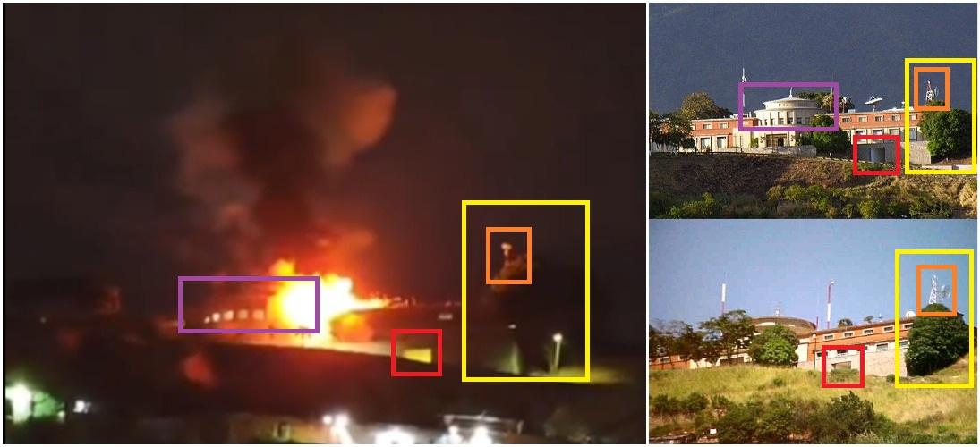 AFP установи, че горящата сграда, която се вижда на видеото, всъщност е бившата Военноморска обсерватория Cagigal, както се вижда от сравнението по-долу, в което са използвани екранни снимки от Facebook страница, носеща името на обсерваторията, както и от страницата в Wikipedia на официалната ѝ радиостанция за сигнал за точно време.