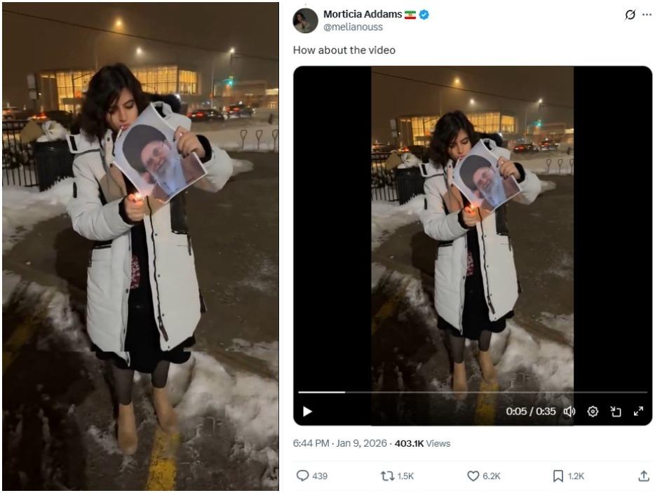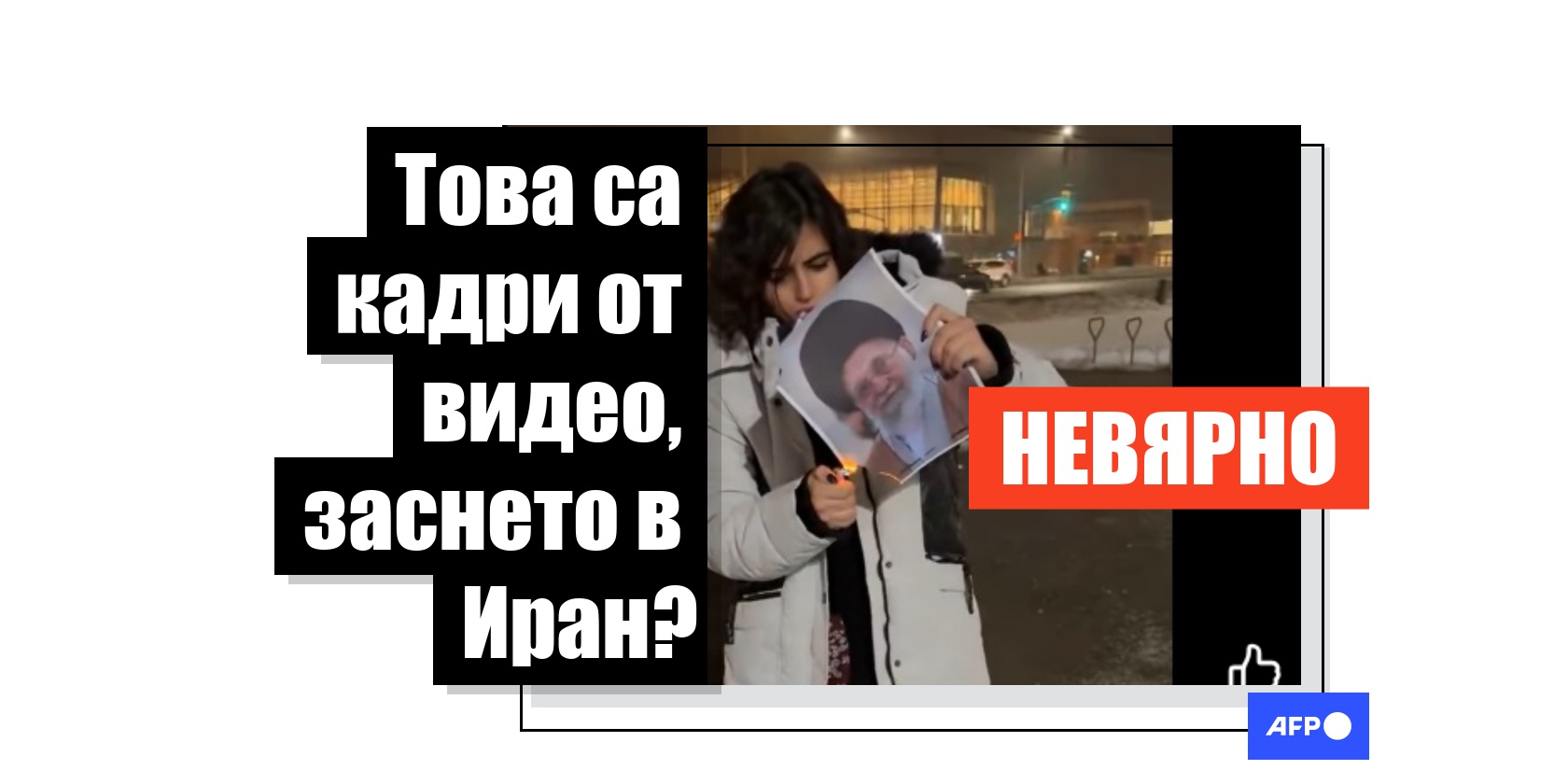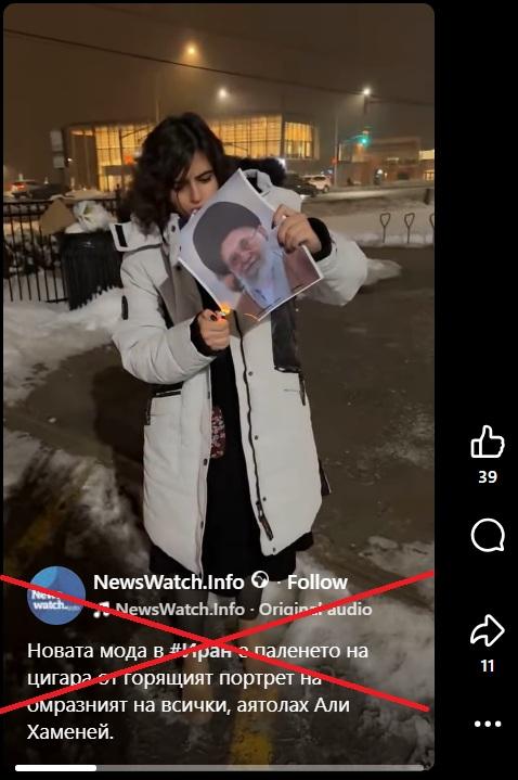 В началото на януари иранците излязоха на протест срещу репресиите и високите цени. В този контекст потребителите споделиха видео, за което твърдят, че е заснето в Иран, показващо жена, която изгаря снимка на върховния лидер аятолах Али Хаменеи. Въпреки че жената във видеоклипа се представя като иранка, тя живее в Канада и е заснела видеоклипа там – факт, потвърден от точното местоположение на заснемане на видеото.