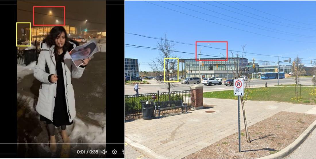 В описанието на акаунта жената във видеото е посочила Торонто, Канада, като място на пребиваване. Португалската организация за проверка на факти Lusa потвърди местоположението, на което видеото е заснето - на паркинг в Ричмънд Хил, в покрайнините на Торонто. Елементите на заден план съвпадат с изображенията в Google Street View .