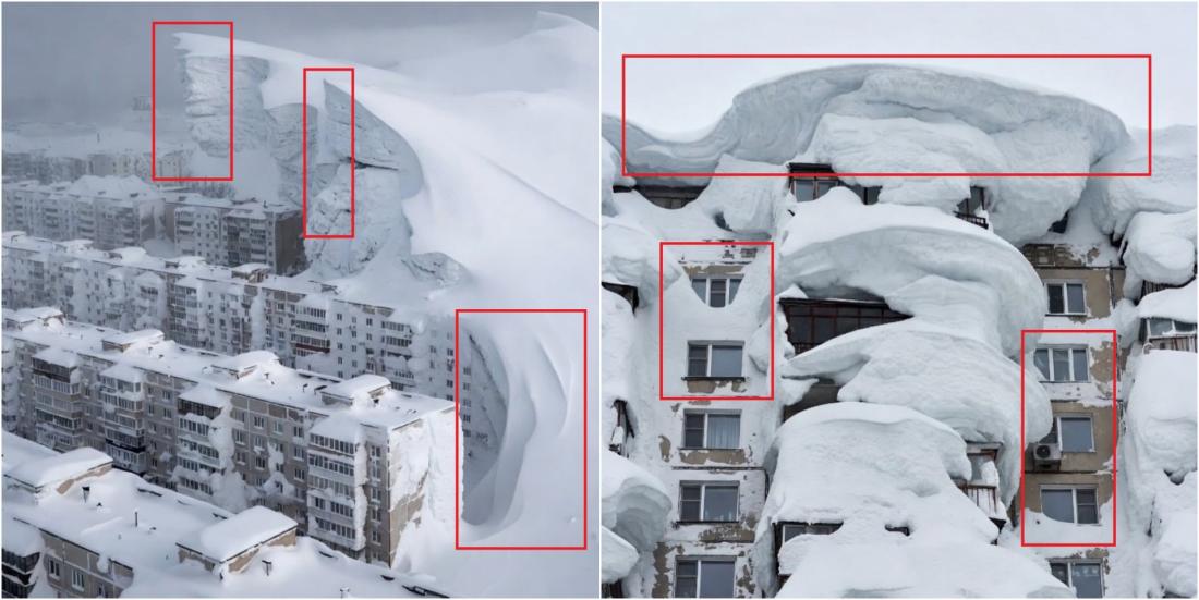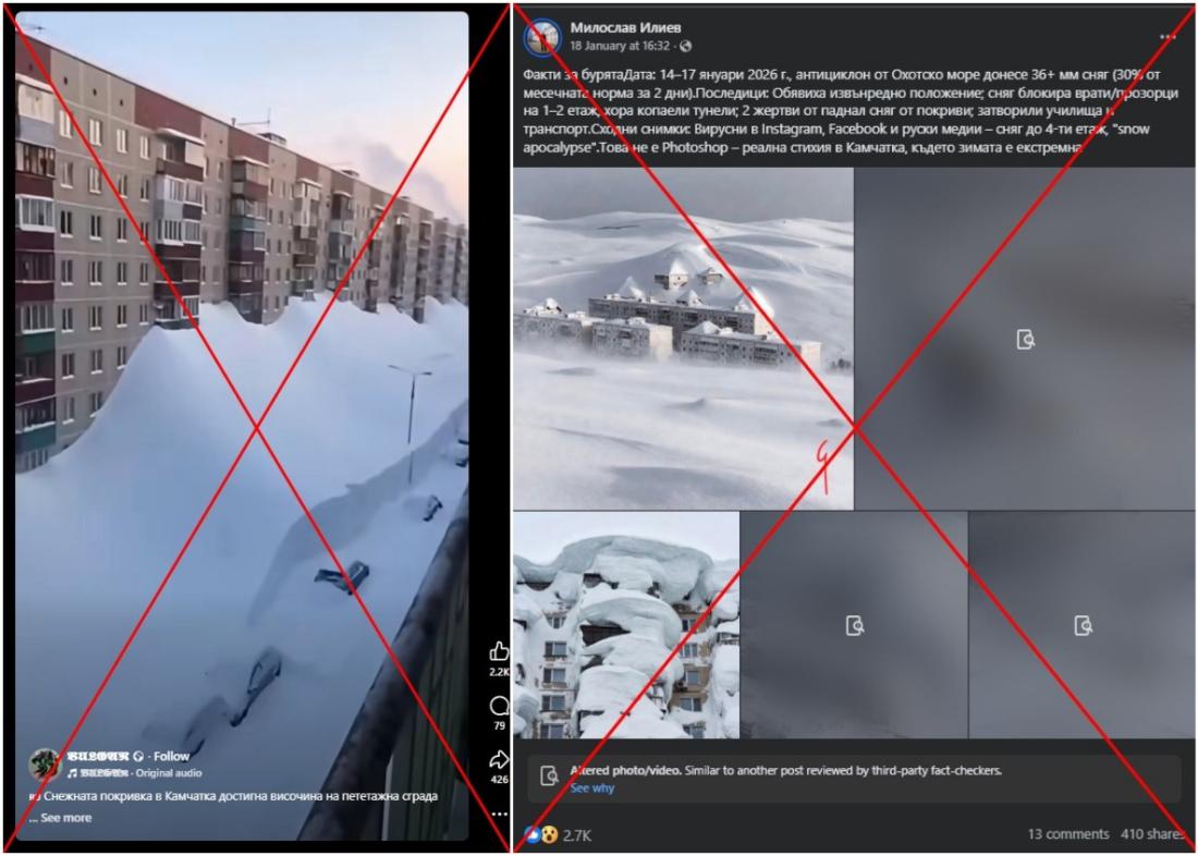 "Това не е Photoshop – реална стихия в Камчатка, където зимата е екстремна", гласи тази публикация, споделена над 400 пъти от 18 януари 2026 г. насам. Друг потребител е споделил видео със същите кадри." Хора, очевидно е, че има намеса на ИИ (AI), но само са "буустнали" реалната ситуация! Т.е., хващат реални кадри с големи снежни преспи от навяванията, които на места НАИСТИНА стигат до 4-тия етаж на някои сгради!!! и ги правят да изглеждат, че са до покрива...", пише потребителят.
