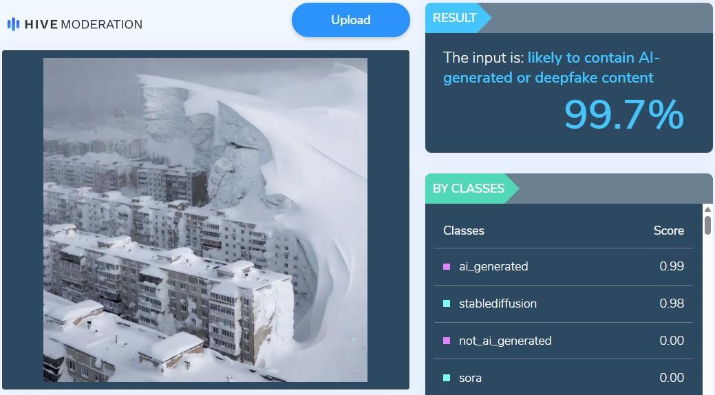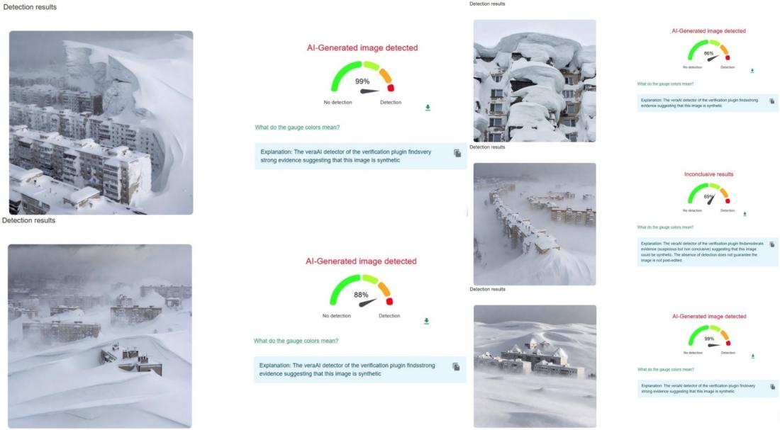 Визуалните неточности също показват, че изображенията не са автентични. Снегът изглежда необичайно гладък и симетричен или оформен в равномерно отсечена снежна козирка. В архитектурните детайли като прозорците и балконите също има неточности и изкривявания, типични за изображенията, създадени от изкуствен интелект.