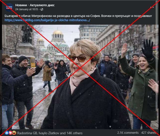 "България я обича: Митрофанова на разходка в центъра на София. Всички я прегръщат и поздравяват", гласи публикация във Facebook, придружена от изображението. Снимката е споделена над 400 пъти от 24 януари 2026 г. насам.