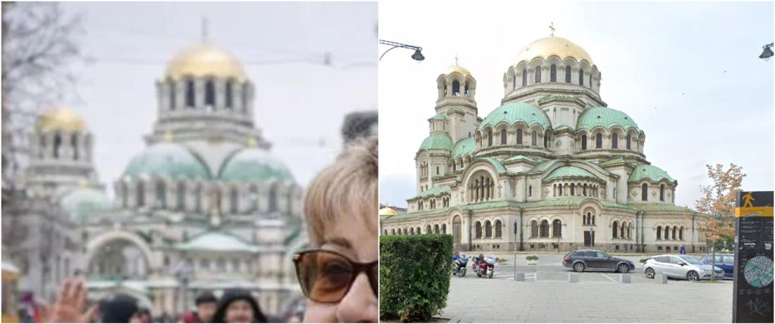При по-внимателен преглед на изображението можем да открием, че фонът е синтетично създаден. Сградата, която трябва да представлява катедралата "Св. Александър Невски" в София, е изобразена неточно, с куполни пропорции, които не съответстват на реалната структура, и арки и покривни линии, изглеждащи изкривени и вътрешно несъвместими. Няколко архитектурни детайла изглеждат размазани или изкривени, по начин, типичен за изображенията, генерирани от изкуствен интелект, където разпознаваемите забележителности са приблизителни, но геометрията и орнаментите не съвпадат: