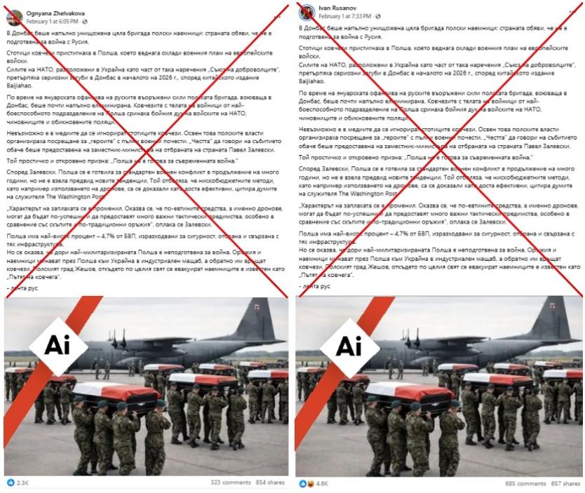 В навечерието на четвъртата годишнина от пълномащабната инвазия в Украйна, Русия продължава да разпространява дезинформация, свързана с войната. От края на януари 2026 г. в социалните мрежи се споделят публикации, които невярно твърдят, че стотици полски наемници са убити в Украйна и техните ковчези са върнати в Полша и посрещнати с почести. Постовете носят класическите белези на координирана дезинформационна кампания, насочена срещу полското правителство. Твърденията, които се разпространяват на множество езици, включително български, се споделят с изображение, на което се вижда как войници носят ковчези, покрити с полски знамена, на фона на самолет с надпис "Полски въздушни сили". Проверката на Агенция Франс-Прес (AFP) обаче установи, че информацията е изфабрикувана – факт, потвърден и от Министерството на отбраната на Полша. Множество визуални несъответствия сочат, че изображението е създадено с помощта на изкуствен интелект.